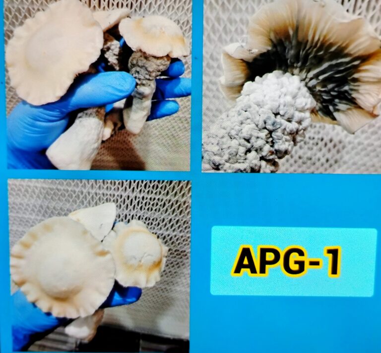 This is a new strain that was created in the summer of 2025. Its a creation that came from serial spore dilution and the results are Albino Hillbilly Pumpkin x Albino Makilla Gorilla ( Albino Pumpkin Gorilla) F1 This genetic doesn’t have years of stability but it also didn’t need it. It first produced small blob like formations but they grow into medium to large size fruits with wide white caps with blue hues in the center. The stipes get bumpy and Gills turn from white to blue as maturity peaks.