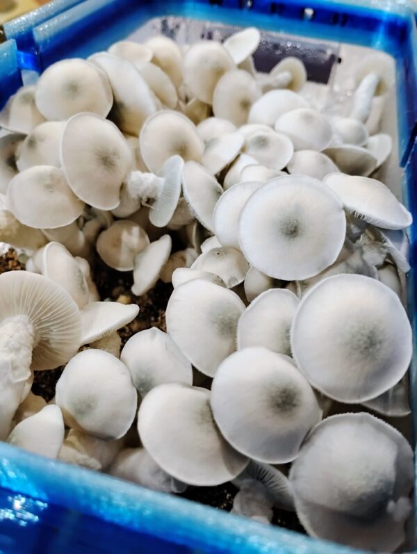 Gandalf x makilla gorilla. This genetic gives canopy flushes of albino fruits with caps that turn green at maturity.